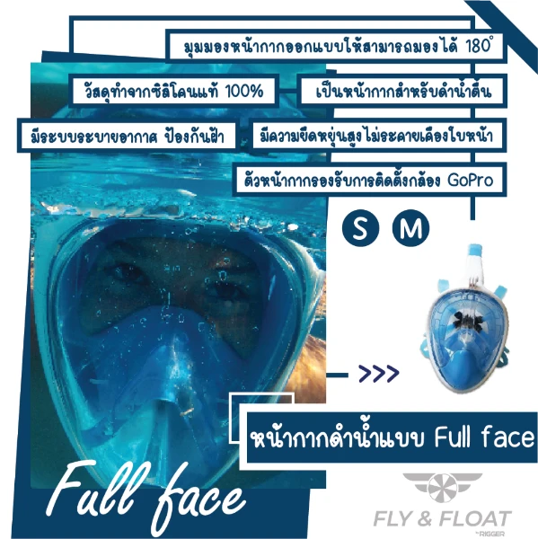 มุมมองของหน้ากากออกแบบให้สามารถมองได้ 180 องศา วัสดุทำจากซิลิโคนแท้ 100% มีความยืดหยุ่นสูง นิ่มไม่ระคายเคืองใบหน้า มีระบบระบายอากาศ ป้องกันฝ้า ตัวหน้ากากรองรับการติดตั้งกล้อง GoPro