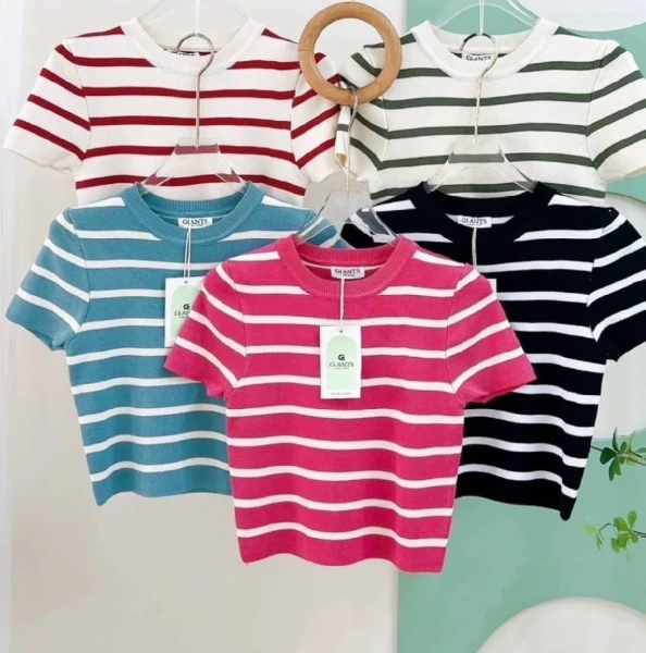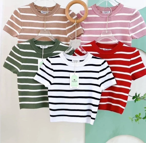 งานเสื้อคอกลมตัวสั้นผ้าริ้วไหมพรม เนื้อดีมากนุ่ม ราคา 200 บาท คะ