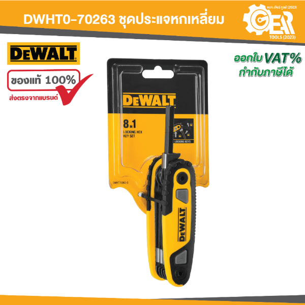 DEWALT ชุดประแจหกเหลี่ยม DeWALT รุ่น DWHT0-70263 สเปคสินค้าและคุณสมบัติ 8 PCE SET มีตามขนาดที่ต้องการ 8 ขนาดPATENTED LOCKING FEATURE ปุ่มจับป้องกันนิ้ว ให้ใช้งานได้ดีขึ้น กุญแจหกเหลี่ยมสำหรับล็อคแบบพับได้ของ Dewakt® (มม.) มีคุณสมบัติการล็อคแบบปุ่มกดสำหรับตำแหน่ง 3 ตำแหน่ง และรวมถึงขนาดประแจหกเหลี่ยมที่ใช้กันทั่วไปถึง 8 ขนาดชุดประกอบด้วย: 2 - 2.5 - 3 - 4 - 5 - 6 - 8 - 10 มม.
